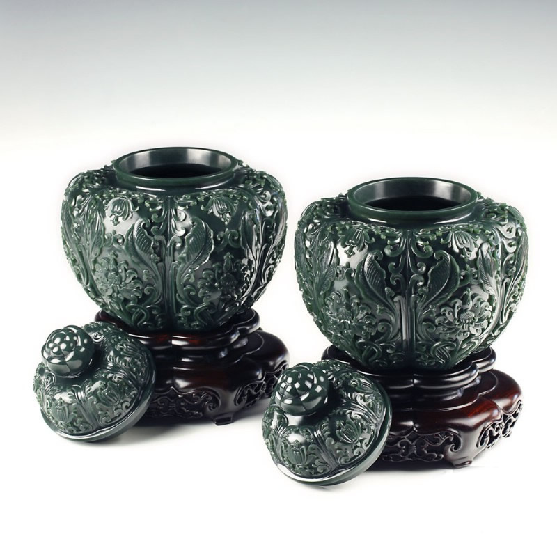 青玉-花卉纹饰瓜棱对罐